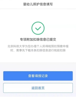 确认后进入“申报方式”界面,如纳税人需要在每月发放工资薪金时享受专项附加扣除,需选择“通过扣缴义务人申报”,并核实扣缴义务人信息是否正确;若需综合所得年度汇算中进行税前扣除,则选择“综合所得年度自行申报”。确认无误后,点击提交,系统提示已完成填报。纳税人可通过“查看填报记录”查询已经申报的信息。