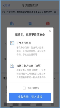点击“婴幼儿照护费用”后,选择扣除年度为2022年(由于新政策自2022年1月1日施行,纳税人无法在2021年及以前年度中填报),点击“确认”后,系统会提示需要准备的子女信息(包括子女姓名、国籍、身份证类型、身份证号码、子女出生日期等),准备完毕后点击“进入填报”。