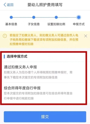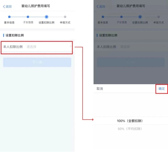 接下来,进入“设置扣除比例”栏,纳税人可根据自身需求,夫妻一方选择100%(全额扣除),或者夫妻双方分别选择50%(平均扣除)。