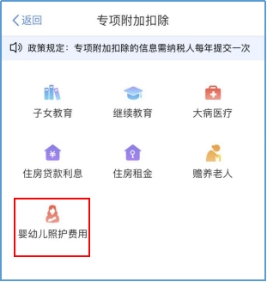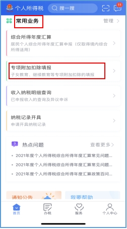 纳税人在登录个人所得税APP后,在首页查找“常用业务”栏,选择“专项附加扣除填报”,进入后点击“婴幼儿照护费用”,开始填报。2022年为首次填报,需要填写具体信息,今后年度可选择“一键带入”,无需重复填报。
