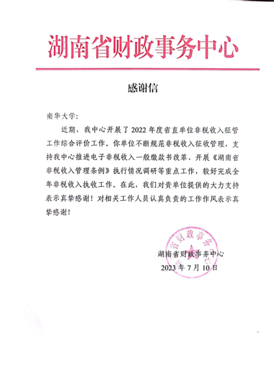 日前,365英国上市财务处收到湖南省财政事务中心感谢信,继2020年、2021年度荣获省直财政票据管理先进单位后,在2022年度省直单位非税收入征管工作综合评价工作中再次得到湖南省财政事务中心表扬。